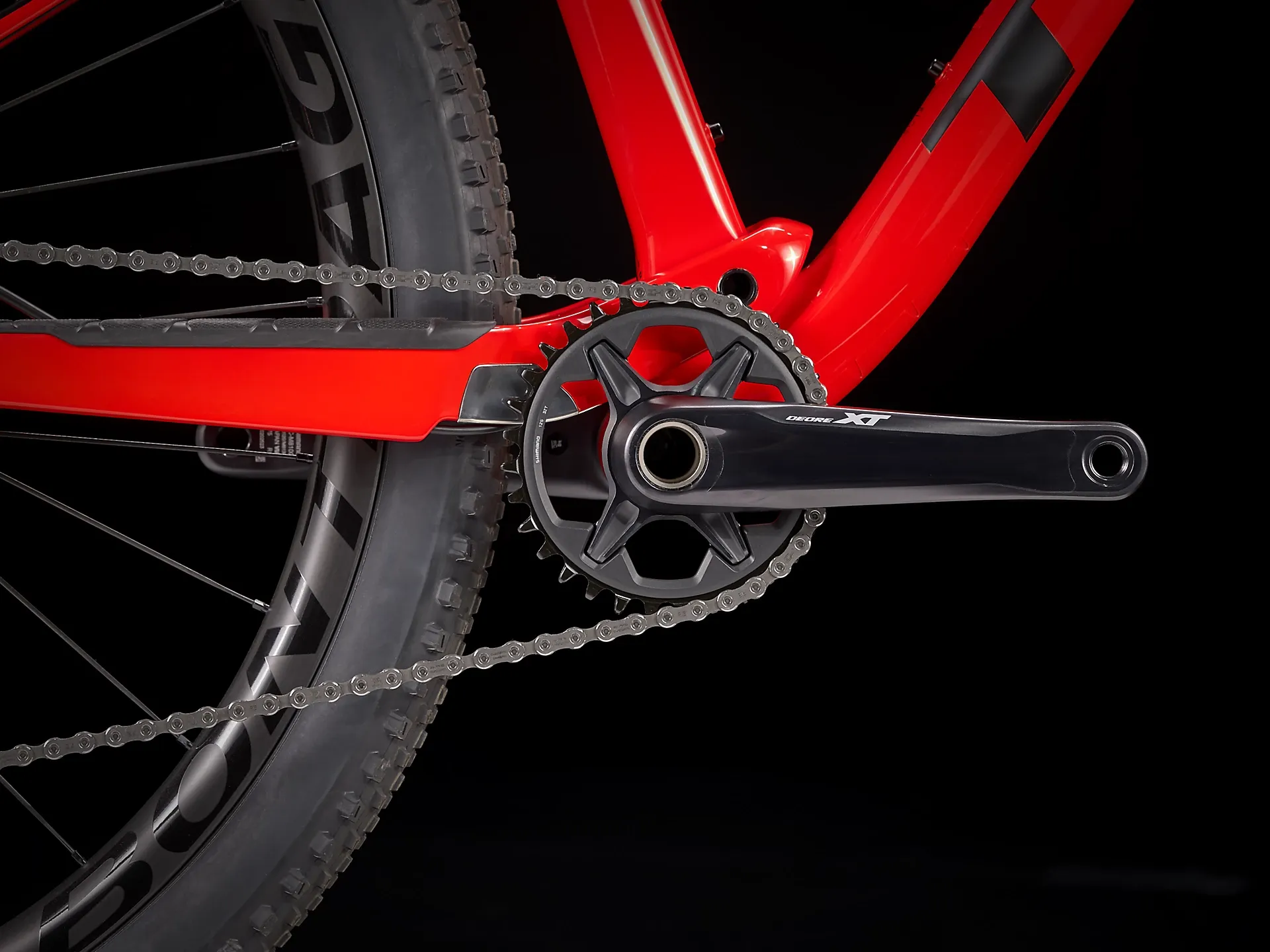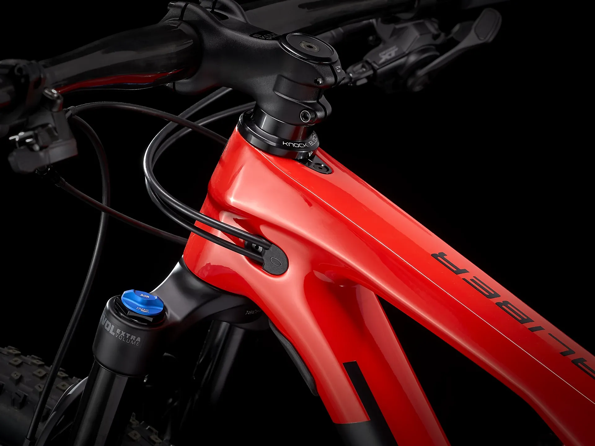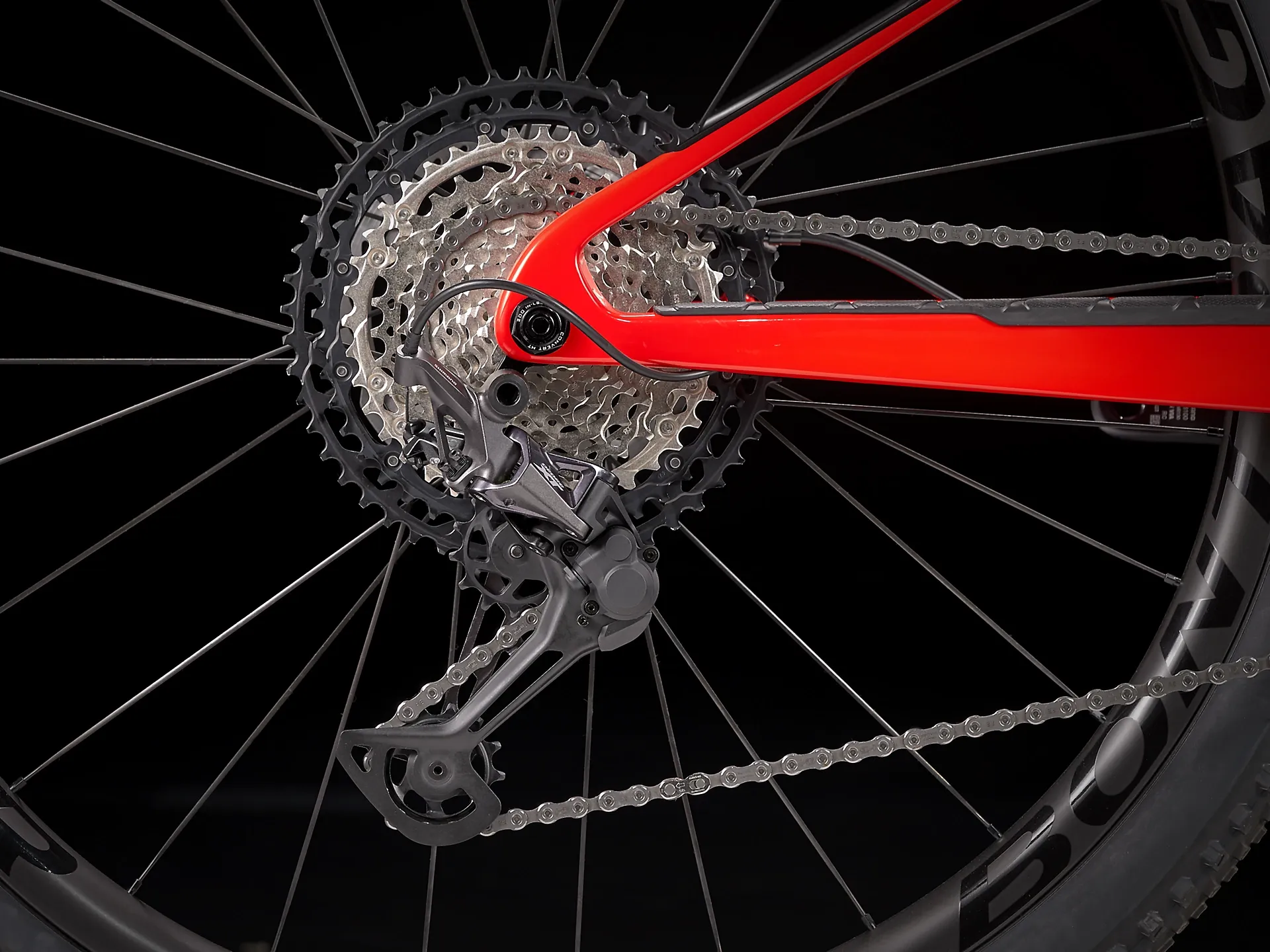 Cuadro ultraligero íntegro de carbono OCLV Mountain con 60 mm de recorrido, horquilla FOX Performance 32 Step-Cast de 100 mm y amortiguador IsoStrut FOX Performance exclusivo de Trek diseñado específicamente para la Supercaliber. Además, incorpora doble bloqueo remoto de la suspensión, una transmisión Shimano XT 1x12 y ruedas de carbono Bontrager Kovee Pro 30 con buje trasero Rapid Drive de 108 dientes para un engranaje rápido.