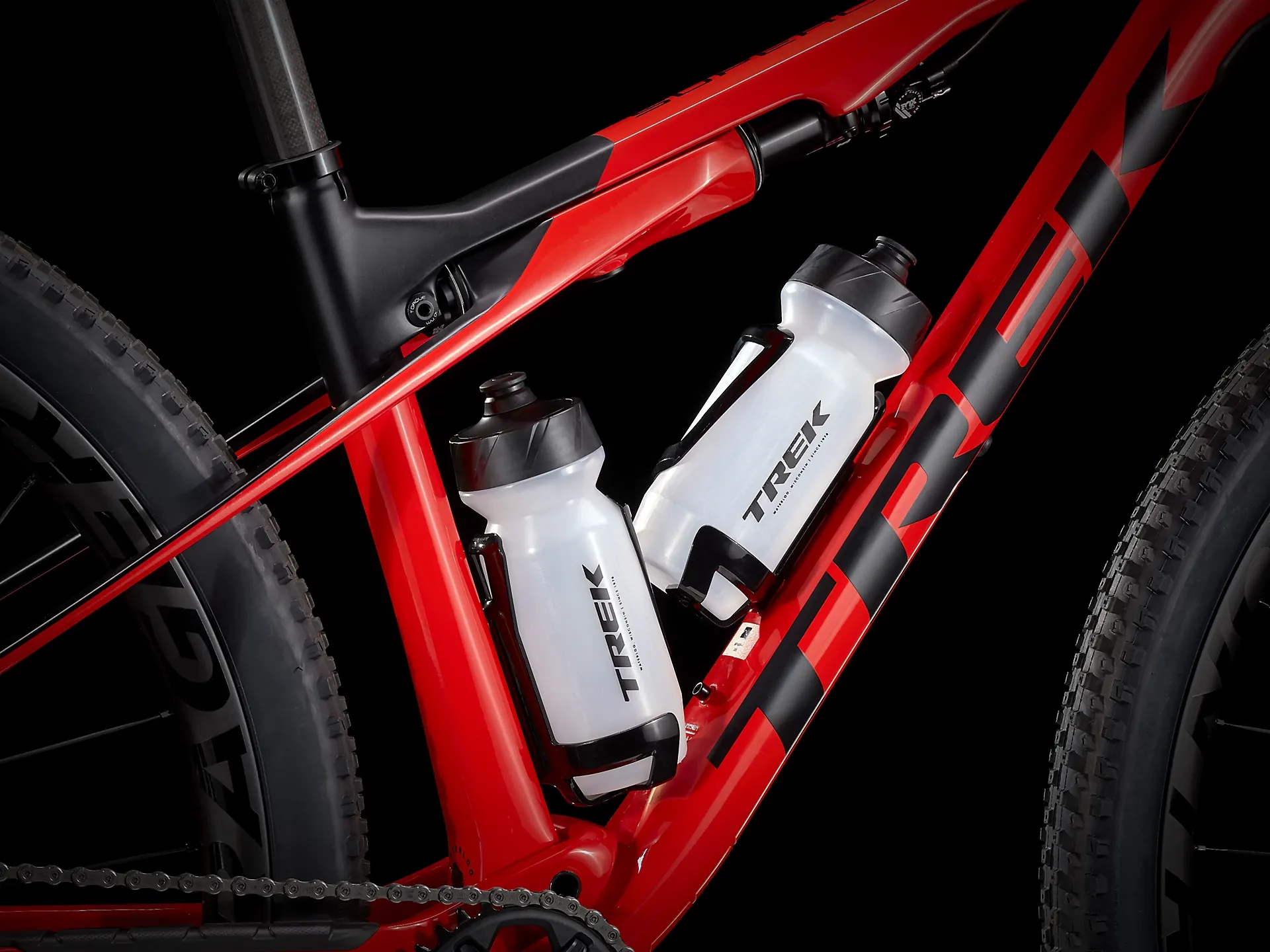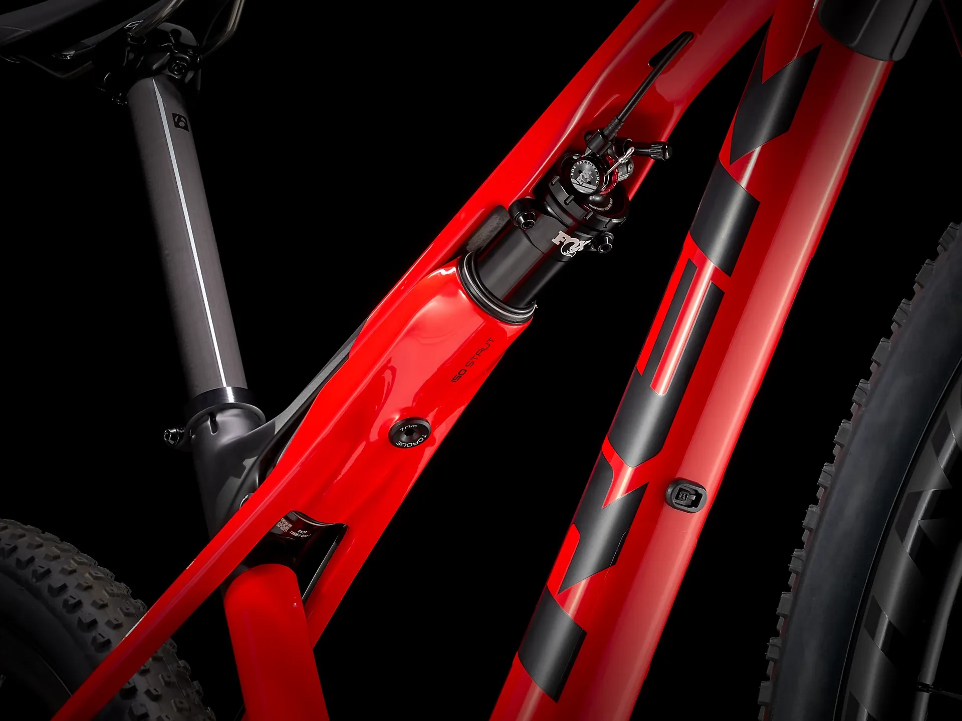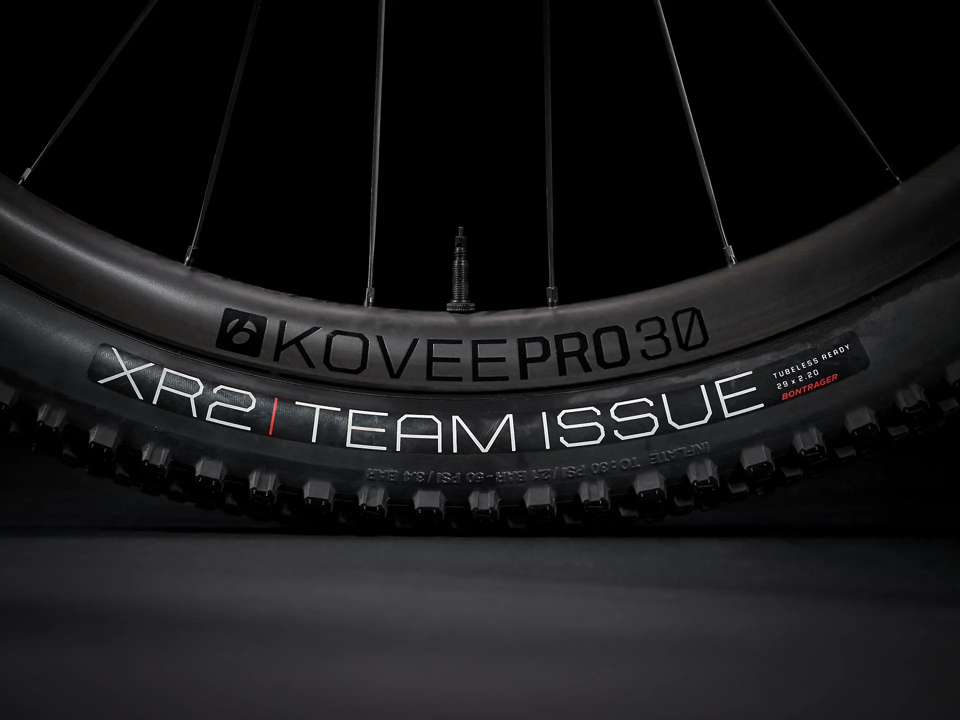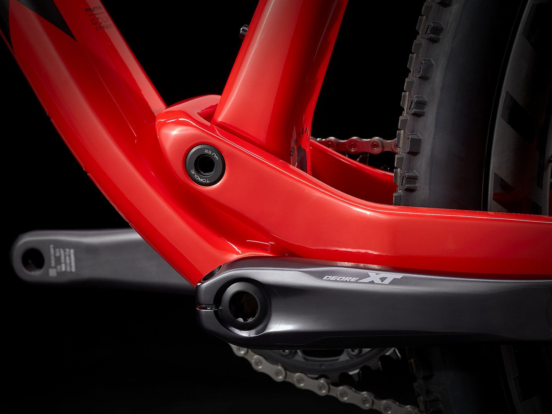 Cuadro ultraligero íntegro de carbono OCLV Mountain con 60 mm de recorrido, horquilla FOX Performance 32 Step-Cast de 100 mm y amortiguador IsoStrut FOX Performance exclusivo de Trek diseñado específicamente para la Supercaliber. Además, incorpora doble bloqueo remoto de la suspensión, una transmisión Shimano XT 1x12 y ruedas de carbono Bontrager Kovee Pro 30 con buje trasero Rapid Drive de 108 dientes para un engranaje rápido.