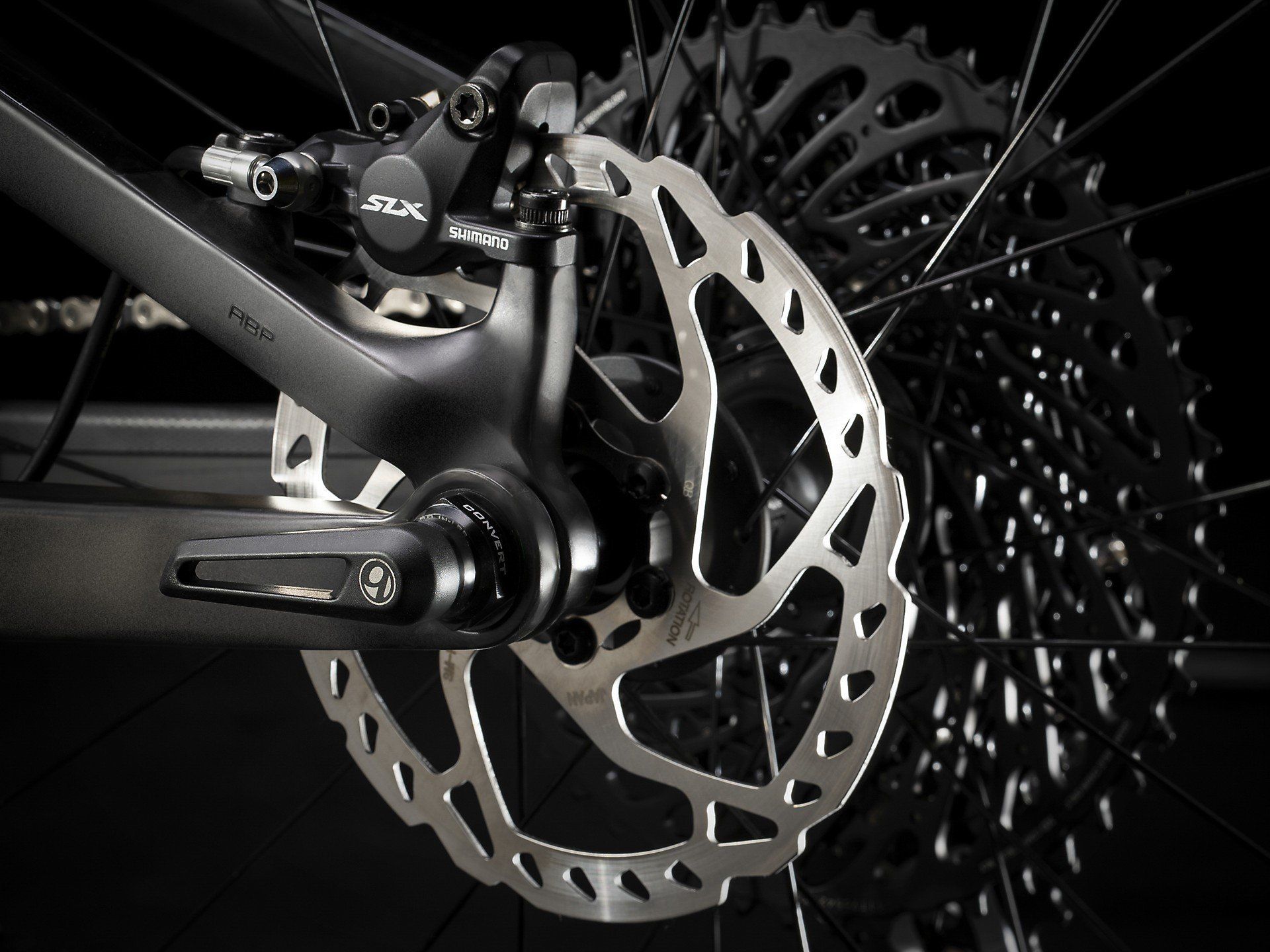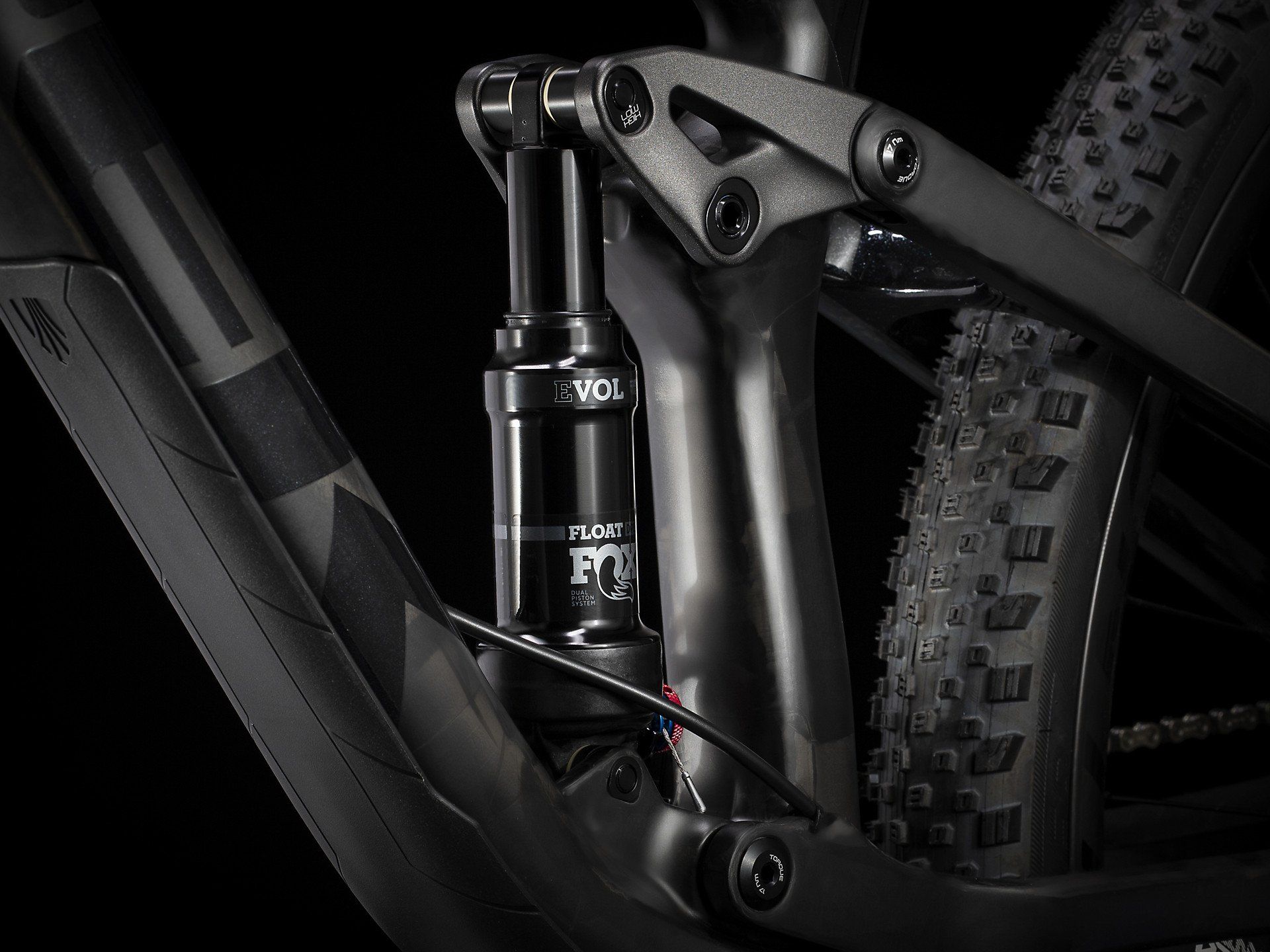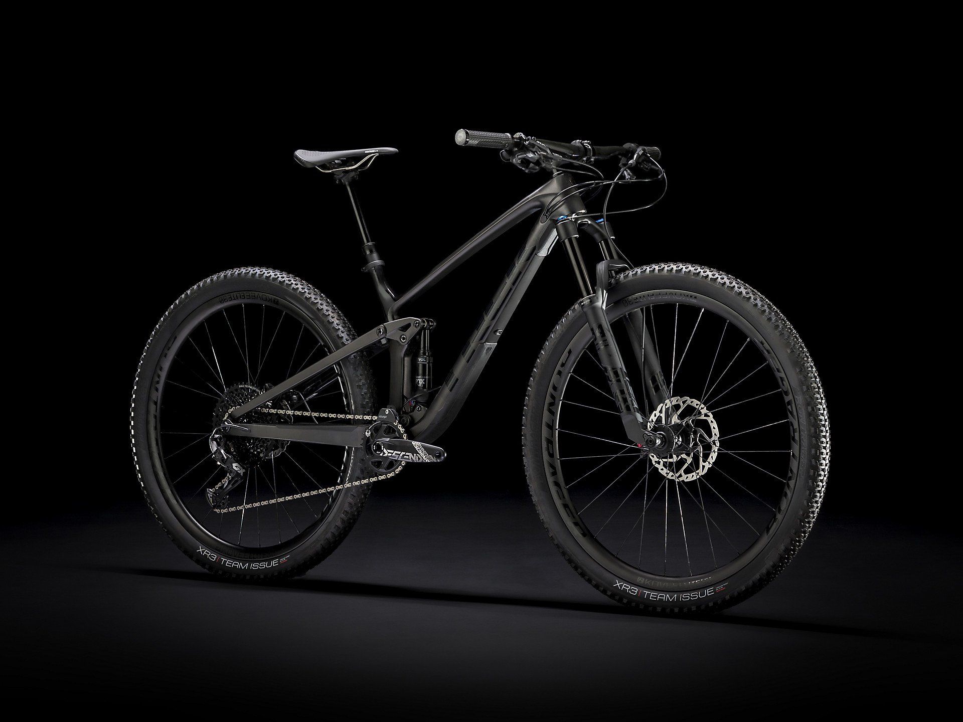Un cuadro íntegro de carbono OCLV Mountain, una nueva horquilla Fox Performance 34 Step-Cast Float con GRIP y 120 mm de recorrido, amortiguador trasero Fox Performance Float de 115 mm y una transmisión SRAM GX Eagle 1x12 con bielas Truvativ Descendant 7k DUB. Está equipada, además, con ruedas anchas de carbono Bontrager Kovee Elite 30 con buje Rapid Drive de 54 dientes para un engranaje rápido, doble bloqueo remoto de la suspensión TwistLoc, tija telescópica Bontrager Line Elite, manillar de carbono OCLV Bontrager Kovee Pro y nuevos frenos de disco hidráulicos Shimano SLX.